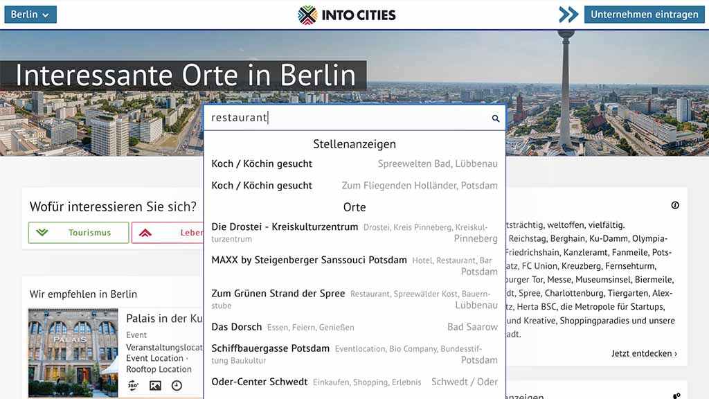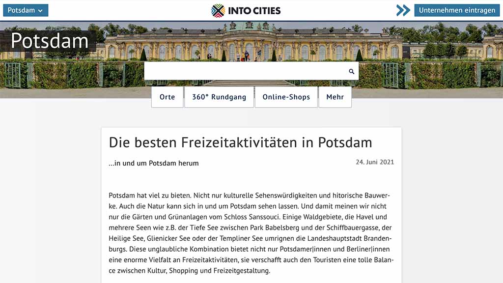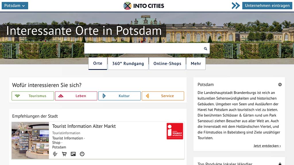 Firmen und Institutionen in Ihrer Stadt, die wir in den letzten Jahren bereits mit einem 360° Rundgang ausgestattet haben, können auf Ihren Wunsch direkt und ohne weitere Kosten in Ihren Stadtrundgang und der zugehörigen Orte-Übersichtsseite integriert werden. Um nachzuschauen, ob bzw. wie viele 360° Rundgänge in Ihrer Stadt bereits existieren, geben Sie bitte einfach den Namen Ihrer Stadt in die globale Suche unseres IntoCities Stadtportals ein.