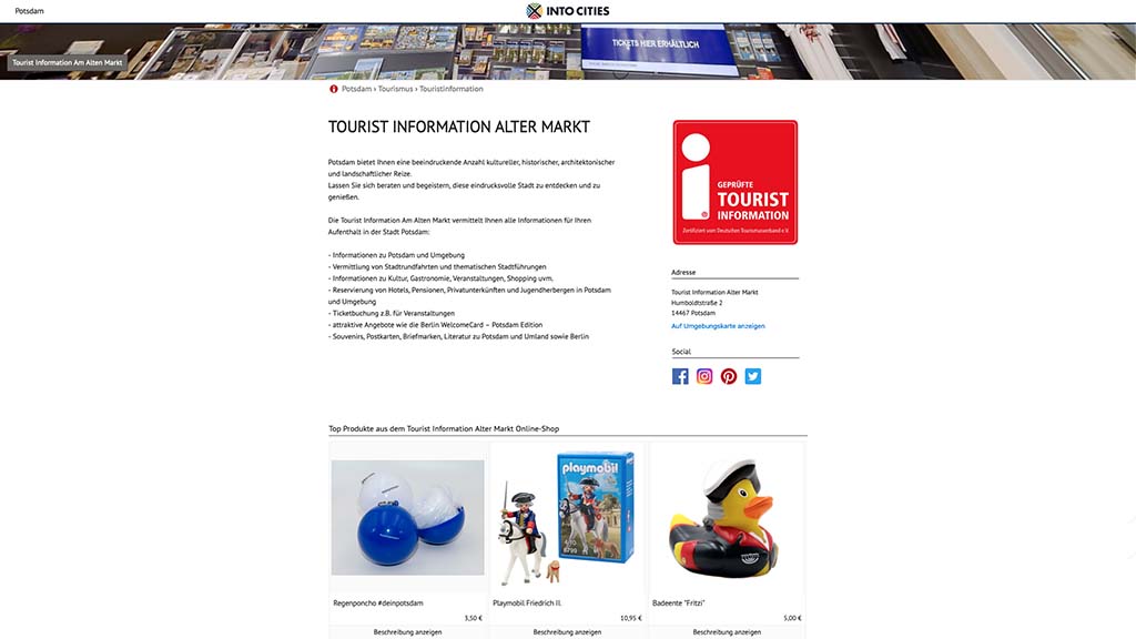 Wir bieten das Gesamtpaket: 360° Stadtrundgang mit 4k Luftpanoramen, interaktiver Karte, POI-Übersicht, Kategorieauswahl, Online-Marktplatz und Stellenmarkt. Wir helfen bei der Integration in die städtischen Onlinemedien und präsentieren die Städte zusätzlich in unserem Stadtportal www.intocities.com. Unser neuestes Add-on: geführte Stadt-Routen für z.B. Shoppingtouren, historische oder kulturelle 360° Rundgänge.