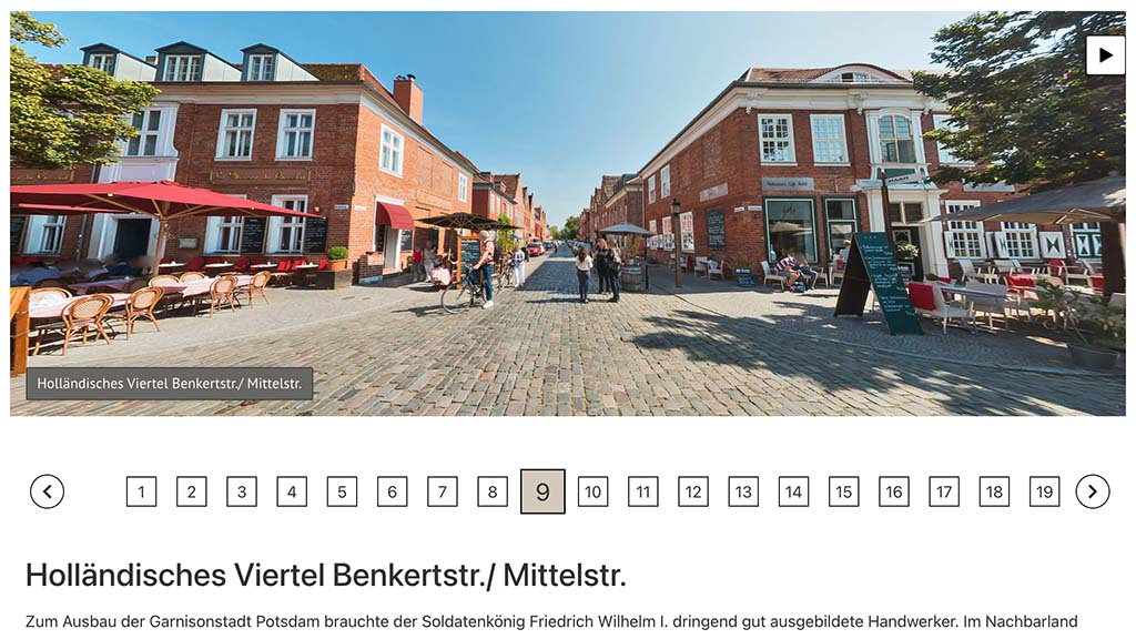Alle POI’s (Point of Interest = interessante Orte), also z.B. städtische Institutionen oder auch Firmen, können im 360° Stadtrundgang angeklickt werden. Der Klick führt zu einer eigens für den POI angelegten One-Page-Website, die ausführliche Informationen bereithält. Je nach individuellen Wünschen und Vorstellungen können hier alle Techniken der modernen Websitegestaltung eingesetzt werden.